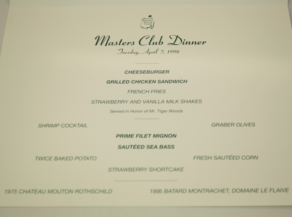 Take Tiger Woods’ 1998 dinner—a nod to his upbringing with cheeseburgers, grilled chicken sandwiches, fries, and milkshakes. Simple, familiar, and completely unpretentious for a room of legends.